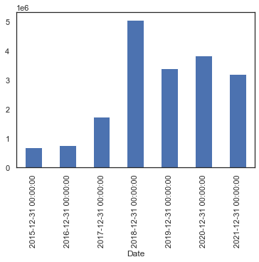 dataset['Volume'].resample('Y').mean().plot.bar()