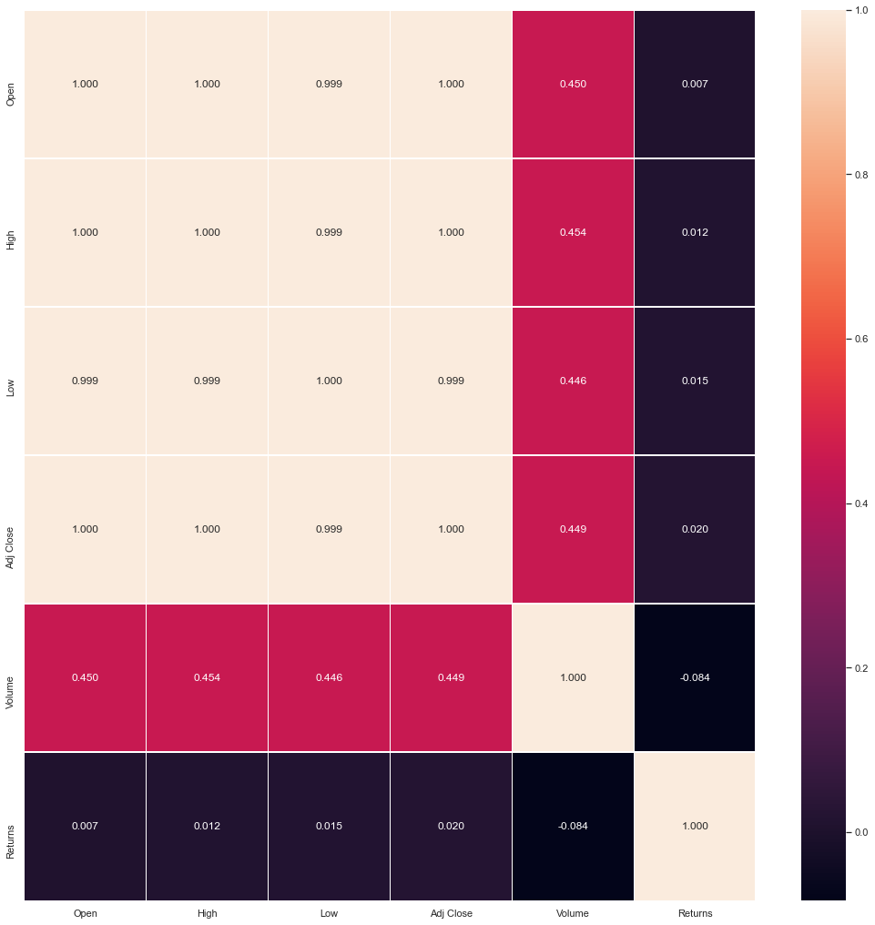 sns.heatmap(dataset[['Open', 'High', 'Low', 'Adj Close', 'Volume', 'Returns']].corr(),