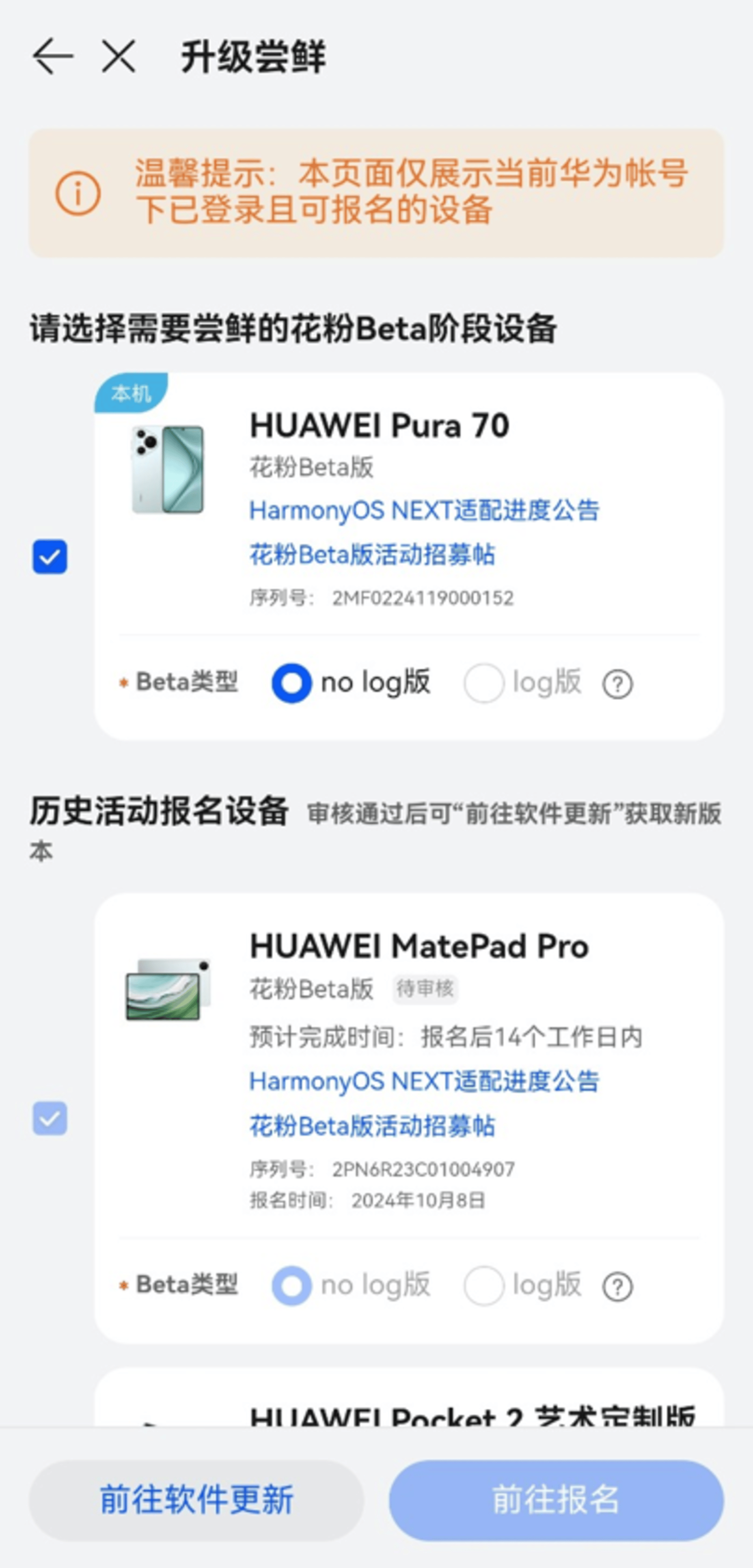 如下图显示,除了Mate 60 和 Mate X5 两个公测系列的机型外,Pura 70 系列、 Pocket 2 系列及 MatePad Pro 11 英寸2024款也可以升级鸿蒙NEXT 花粉 Beta 版。