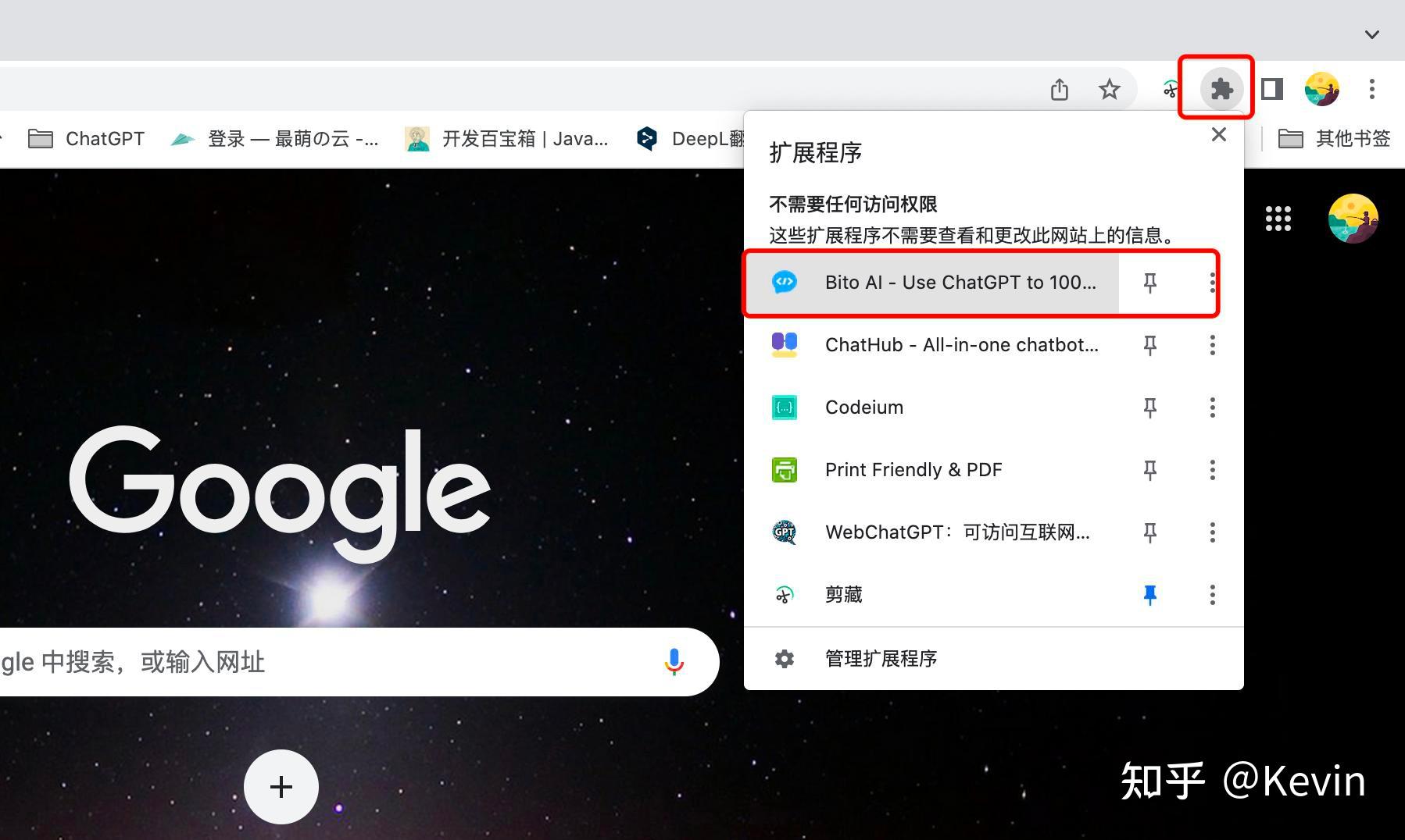 安装完成后,Bito AI将出现在Chrome工具栏中。我们建议您将其固定在工具栏上以便快速访问。