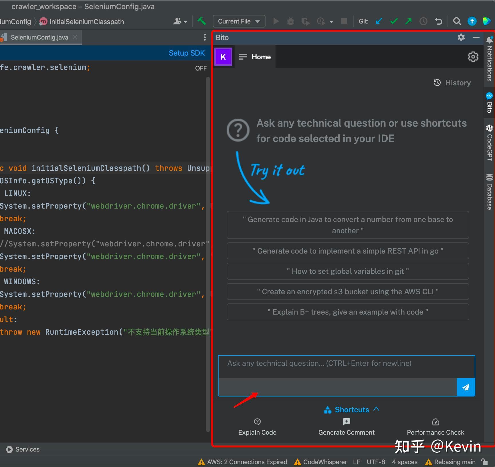登录成功后,在红色箭头指向的本文输入框就可以对Bito提各种问题了。
