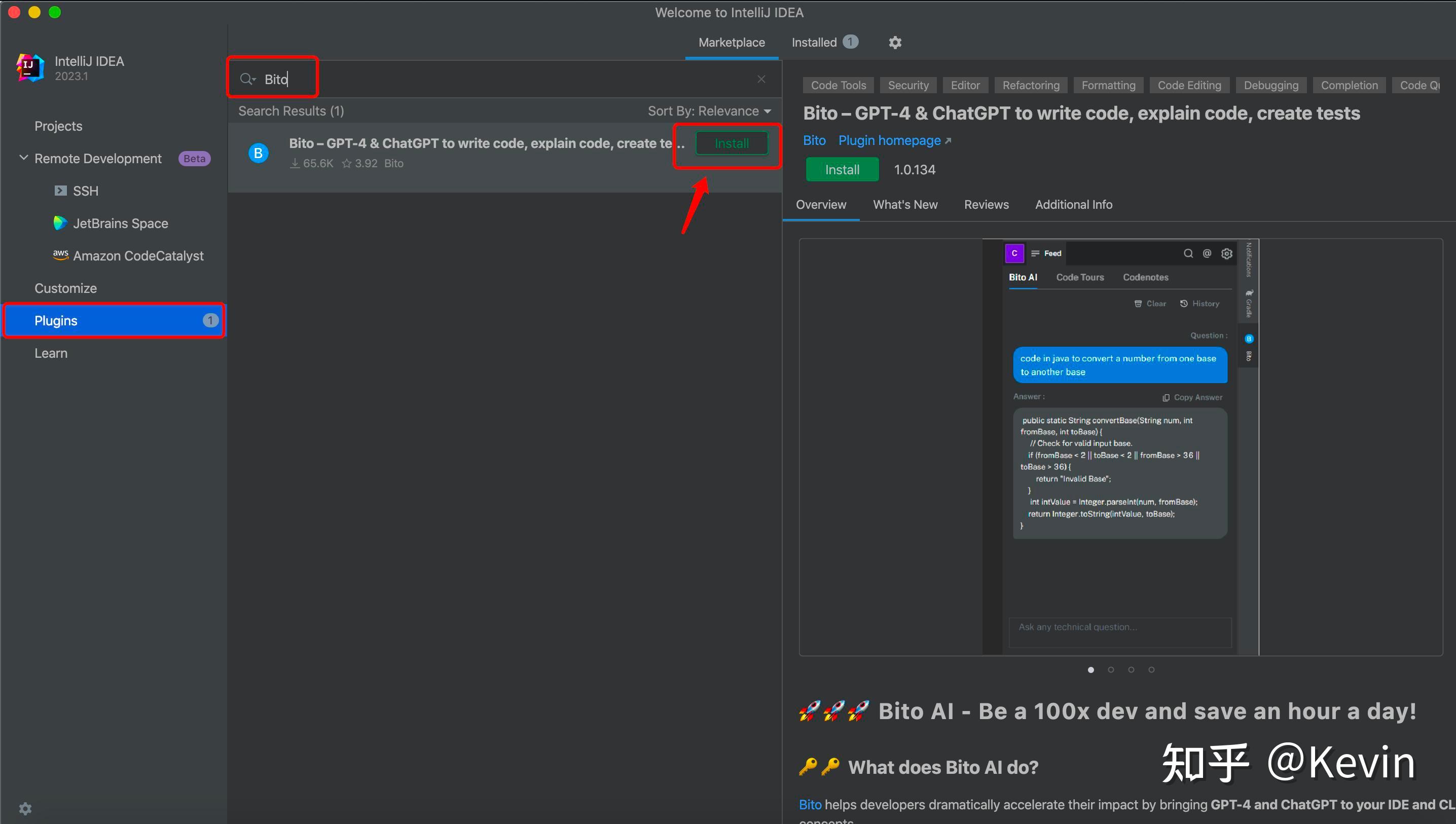 在JetBrains IDE,如IntelliJ IDEA中,请选择“文件”(File)-> “设置”(Settings)打开“设置”对话框,然后在“设置”对话框中单击“插件”(Plugins)-> “市场”(Marketplace)选项卡。搜索Bito扩展即可。(Mac版本直接点击主界面的Plugins菜单进入,或者通过IntelliJ IDEA → Preferences → Plugins进入)