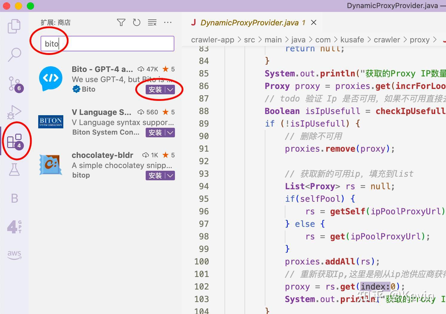 在Visual Studio Code中,点击扩展选项卡并搜索“Bito"。