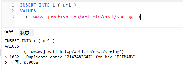 INSERT INTO t (url) VALUES ('wwww.javafish.top/article/erwt/spring')