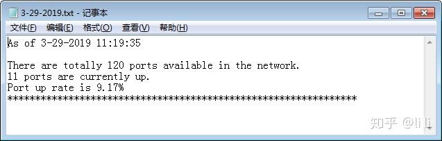 之后,写第二个脚本来读取该文本文件中所保存的IP地址,依次登录所有这些可达的交换机,输入命令dis int brief | i up命令查看有哪些端口是up的,再配合re这个模块(正则表达式),来匹配我们所要的用户端物理端口号(Enx/x/x),统计它们的总数,即可得到当前一个交换机有多少物理端口是up的。 (注:因为dis int brief | i up的结果里也会出现虚拟端口,比如vlan或者loopback端口,所以这里强调的是用正则表达式来匹配用户端物理端口Enx/x/x)