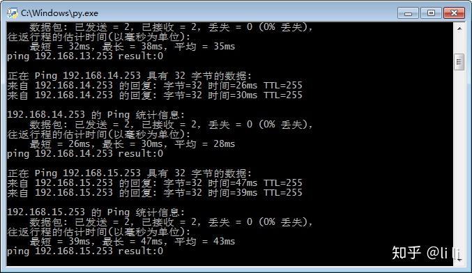 根据需求我们可以写两个脚本,第一个脚本用来ping5个网段下所有交换机的管理IP,因为掩码是/24,IP地址的最后一位我们可以指定python来ping .1到.254,然后将所有可达的交换机IP写入并保存在一个名为reachable_ip.txt的文本文件中。