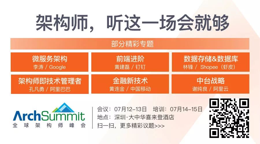 ArchSummit 全球架构师峰会是面向高端技术管理者、架构师的技术会议,54% 参会者拥有 8 年以上工作经验。2019 年 7 月深圳站囊括了运维新突破、微服务架构、中台战略、技术选型、人机交互、前端进阶等最新技术和前沿动态,详细日程请扫描下图二维码或点击【阅读原文】: