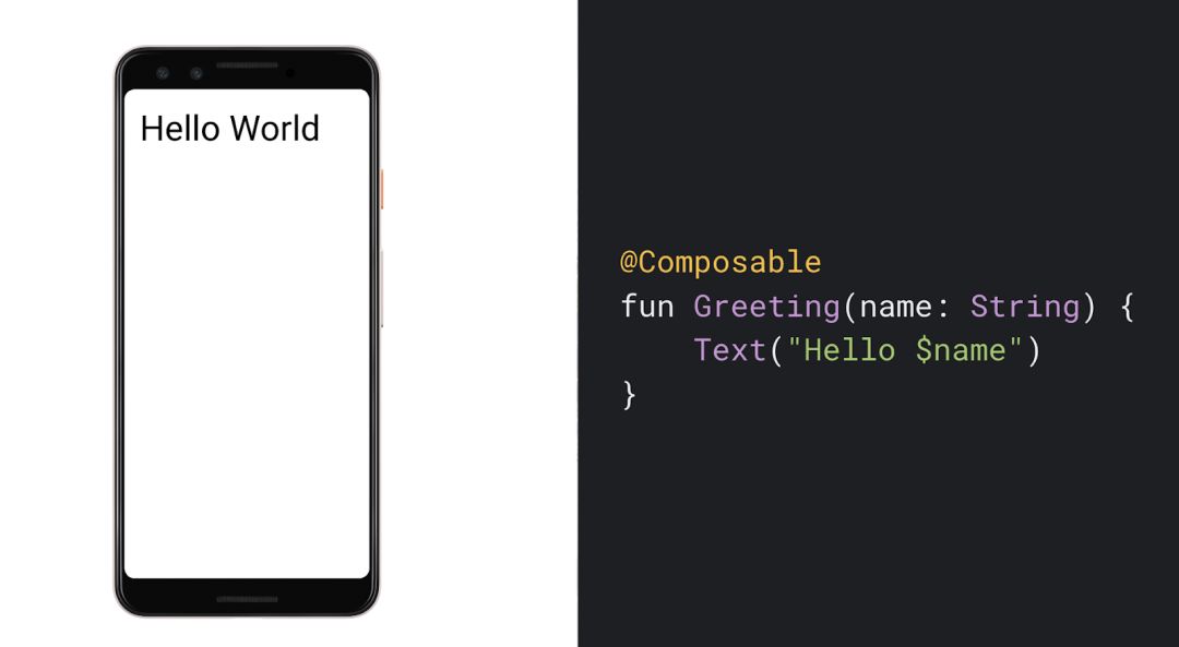 Compose 应用程序由可组合函数组成,可以把应用程序数据转换为用户界面层次结构。所需要的就是一个函数来创建新的用户界面组件。要创建一个可组合的函数,只需要给函数名添加 @Composable 注释。在底层,Compose 使用自定义 Kotlin 编译器插件,因此,当底层数据变化时, 可以重新调用可组合函数,以生成更新的用户接口层次结构。下面的简单例子是把一串字符输出到屏幕上。