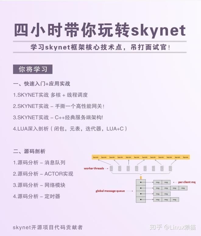 推荐一个Skynet视频讲解: 游戏开发核心技术点 skynet训练营-学习视频教程-腾讯课堂 ,讲解详细还有文档资料配套学习,新手老牛都可以看看的哦。