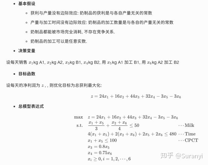 一奶制品加工厂用牛奶生产 A1, A2 两种奶制品,1 桶牛奶可以在甲类设备上用 12h 加工成 3kg A1,或者在乙类设备上用 8h 加工成 4kg A2. 根据市场需求,生产的 A1, A2 全部能售出,且每千克 A1 获利 24, ,每千克 A2 获利 16 , . 现在加工厂每天能得到 50 桶牛奶的供应,每天正式工人总的劳动时间为 480h,并且甲类设备每天至多能加工 100kg A1,乙类设备的加工能力没有限制. 该厂还开发了奶制品的深加工技术: 用 2h 和 3, 加工费,可将 1kg A1 加工成 0.8kg 高级奶制品 B1,也可将 1kg A2 加工成 0.75kg 高级奶制品 B2,每千克 B1 能获利 44, ,每千克 B2 能获利 32 , . 试为该厂制订一个生产销售计划,使每天的净利润最大,并讨论以下问题: