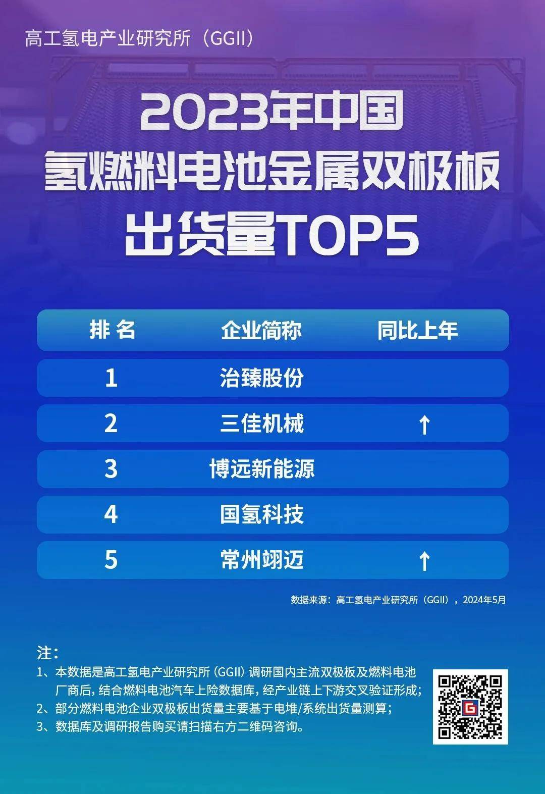 根据GGII调研,按照双极板出货量统一口径,2023年国内氢燃料电池金属双极板出货TOP5企业分别为:治臻股份、三佳机械、博远新能源、国氢科技、常州翊迈。其中,金属双极板出货量TOP3企业均为专业的第三方金属双极板厂商。