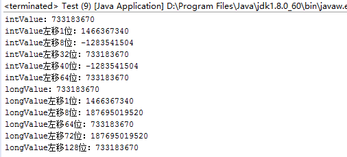 System.out.println("intValue左移32位:" + (intValue << 32));//求余为32%32=0,相当于左移0位(不移位)