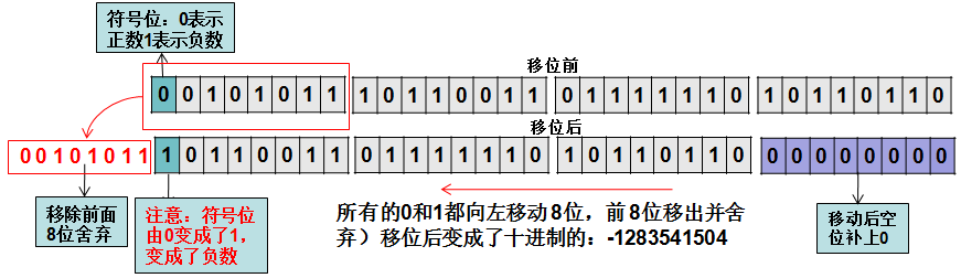 左移8位后变成了十进制的值为:-1283541504,移动8位后,由于首位变成了1,也就是说成了负数,在使用中要考虑变成负数的情况。