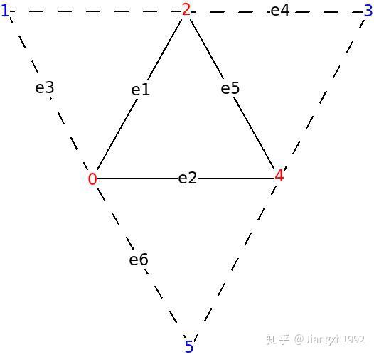 轮廓计算应该在管线的那个阶段最好呢?首先考虑我们要对光线方向和三角形法线及其三个邻接三角形的法线求点积,也就是说我们 需要访问整个图元的数据,所以在VS顶点着色阶段是不行的。这样在GS几何着色阶段似乎是可行的,因为可以访问图元的所有顶点数据 ,但是邻接三角形的数据如何访问呢?好在OpenGL在设计的时候考虑到了这方面的事情, 创建了一种叫做'triangle with adjacencies'的拓扑类型。这样只要你在顶点buffer中提供了邻接三角形的信息,在GS阶段每个三角形就可以访问到6个顶点数据,而不是3个 。多出来的三个就是三个邻接三角形各自独有的第三个顶点了。具体可以看下图: