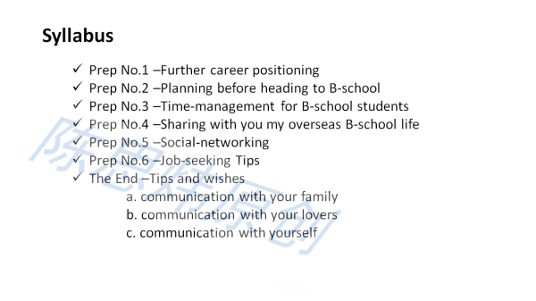 如果你是已经定好offer准备赴美商学院留学的学生,建议做好进一步的深度的职业规划,以及在海外读商学院必须具备的“武器”- 社交技能,在美国顶尖商学院毕业的中国学生中只有30%可以毕业时找到理想工作,相信没有人希望自己成为剩下的70%,我会在近期推出“行前起飞系列课程”(共8-10小时课程),并将相关的部分精选内容带来知乎的本专栏中,如有兴趣欢迎私聊。