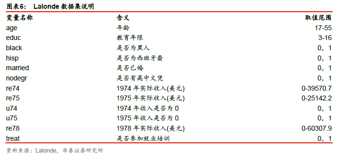 Lalonde数据集是因果推断领域的经典数据集,由Robert Lalonde在1986年整理,数据集的说明如图表6所示: