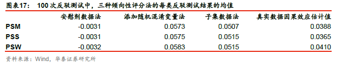 图表17展示了100次反驳测试中,三种倾向性评分法的每类反驳测试结果的均值。我们将三种倾向性评分法在真实数据下的因果效应估计值放在图表17最右侧进行对比。在安慰剂数据法中,由于生成的安慰剂数据(Placebo)替代了真实的处理变量,每个样本是否属于概念的事实已不存在,因此反驳测试中的因果估计效应大幅下降,接近0,这反过来说明了处理变量对结果变量具有一定因果效应。在添加随机混淆变量法和子集数据法中,PSW的反驳测试结果与真实数据因果效应估计值最接近,说明其因果效应估计值可能更可靠。