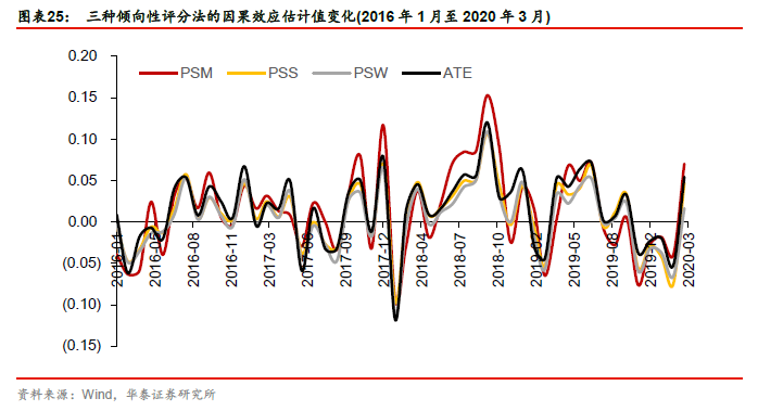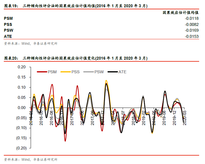 各种倾向性评分法的因果效应估计值在19中,其中倾向性评分匹配法(PSM)因果效应估计值为-0.0118,即在2016年1月至2020年3月这段时间中,属于股票质押概念的股票,其未来一个月收益的排序数相比于不属于该概念的股票要低0.0118。另外为了对比,我们计算ATE,即在不考虑任何混淆变量的情况下,属于股票质押概念的股票和不属于股票质押概念的股票的平均差异。图表20展示了三种倾向性评分法的因果效应估计值变化。