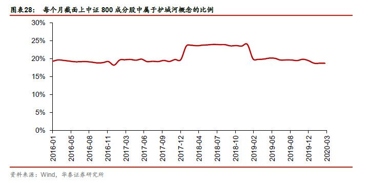 图表28展示了每个月截面上中证800成分股中属于护城河概念的比例。