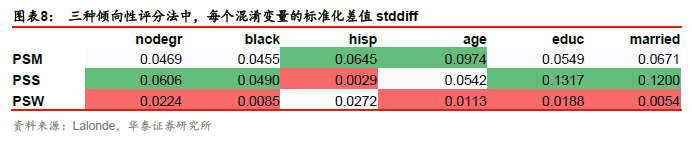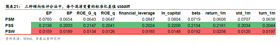 图表21展示了各倾向性评分方法中,每个混淆变量的标准化差值stddiff。总体来看,倾向性评分加权法(PSW)中各混淆变量的标准化差值最小,说明PSW中混淆变量在处理组和对照组间较均衡,其因果效应估计值可能更可靠。