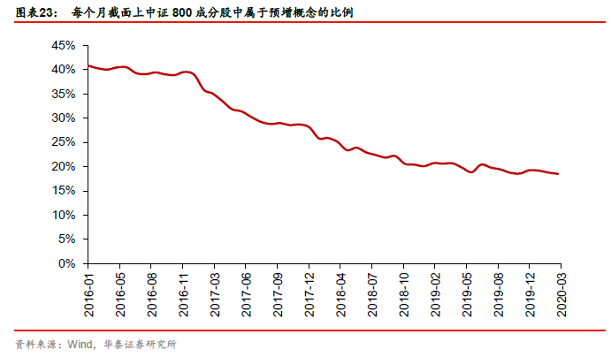 图表23展示了每个月截面上中证800成分股中属于预增概念的比例。