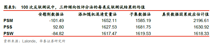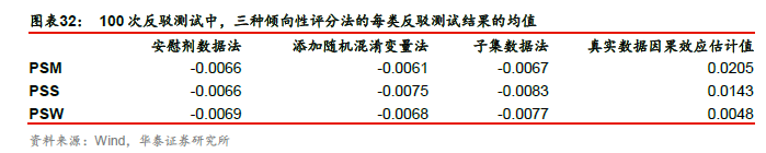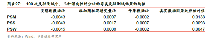 图表27展示了100次反驳测试中,三种倾向性评分法的每类反驳测试结果的均值。我们将三种倾向性评分法在真实数据下的因果效应估计值放在图表27最右侧进行对比。在添加随机混淆变量法和子集数据法中,其估计的因果效应值的绝对值已经小于安慰剂数据法,说明在对原始数据添加干预之后,因果效应已不显著,因此预增概念对于股票收益的正向因果效应是存疑的。另外,PSW的反驳测试结果与真实数据因果效应估计值最接近,说明其因果效应估计值可能更可靠。