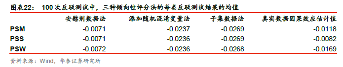 图表22展示了100次反驳测试中,三种倾向性评分法的每类反驳测试结果的均值。我们将三种倾向性评分法在真实数据下的因果效应估计值放在图表22最右侧进行对比。在安慰剂数据法中,由于生成的安慰剂数据(Placebo)替代了真实的处理变量,每个样本是否属于概念的事实已不存在,因此反驳测试中的因果估计效应下降,接近0,这反过来说明了处理变量对结果变量具有一定因果效应。在添加随机混淆变量法和子集数据法中,PSW的反驳测试结果与真实数据因果效应估计值最接近,说明其因果效应估计值可能更可靠。