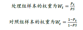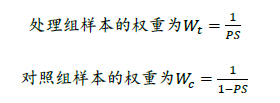 以上两式中,PS是样本的倾向性评分。该加权方法的通俗理解方式为:由于PS是由Logistic回归拟合得到,总体上来看处理组样本的PS靠近1,对照组样本的PS靠近0。PS越小的处理组样本,越容易找到能与之匹配的对照组样本,使用该处理组样本估计的因果效应更可靠,其权重应该更大。所以对于处理组样本来说,其权重 等于PS的倒数。而对照组样本的情况和处理组样本正好相反,故其权重等于(1-PS)的倒数。