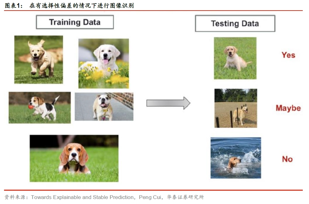首先以一个图像识别问题为例:识别一张图片中是否有狗。如图表1所示,如果训练集有选择性偏差,使得我们拿到的图片有80%都是草地上的狗,这样就会导致在训练集中草地这一特征会和图片中是否有狗这个标签十分相关。基于这样的有偏数据集学习到的预测模型,很有可能会将草地学习成很重要的特征,但显然这是不合理的,图片中的草地并不能决定是否有狗,真正决定图片中是否有狗的特征是狗的鼻子、耳朵、尾巴等等。对于测试集,如果跟训练集一样也是狗在草地上,则模型可以正确地预测;如果图片中的狗在有绿植的沙滩上,模型或许能识别出来;但是如果图片中的狗在水里,模型则大概率会识别不准。因此这样的模型对于未知测试集的预测效果并不稳定。