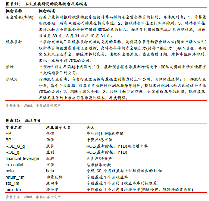 1. 处理变量:股票是否属于某概念。我们所使用的概念数据来自于Wind概念指数成分股,主要研究的股票概念如图表11所示。