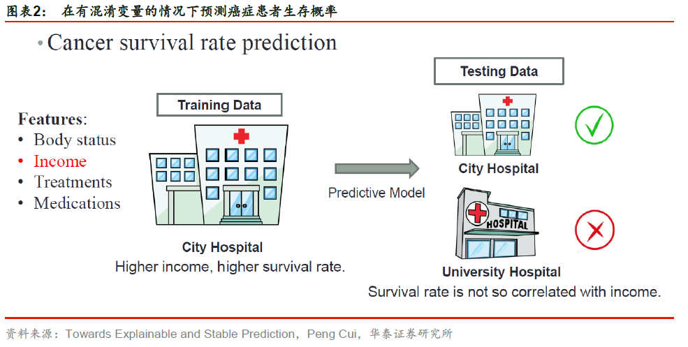 再举一个医疗领域的例子:预测一个癌症患者的生存率。假设我们拿到了某个城市某个医院的数据,基于该数据学习到的模型有可能会把患者的收入学习成很重要的特征。当然这也是有道理的,收入高的患者能负担得起更好的治疗,生存率也会越高。但是收入并不是患者生存率的决定因素,真正影响生存率的是患者接受的治疗水平以及患者本身的身体素质等因素,即使是收入很高的患者,如果没有接受很好的治疗,或者本身体质虚弱,免疫力低下,生存率依然会很低。利用该模型做预测时,如果未来要预测的患者同样来自该医院,我们可能会得到很准确的预测结果。但是如果要预测的患者来自大学校医院,由于校医院对患者给予的治疗不由收入决定,此时的预测结果很可能不准确。