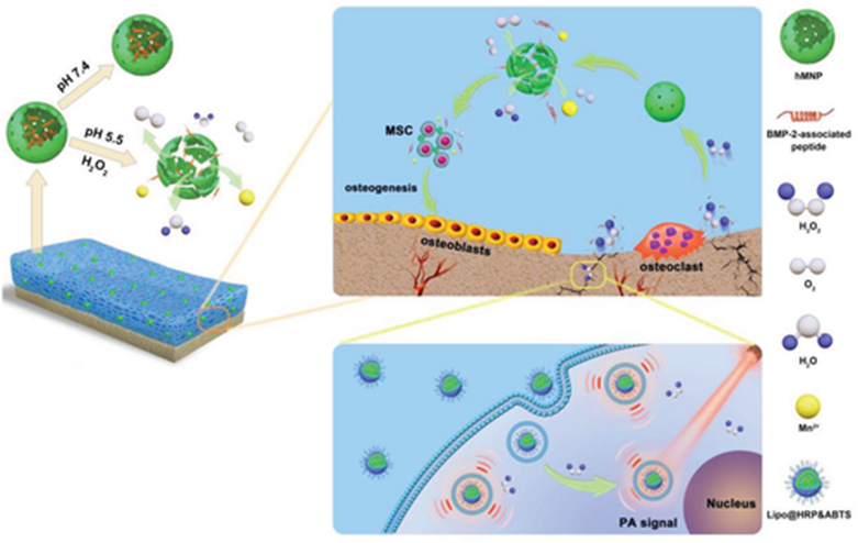 示意图1,研究设计的示意图。 复合水凝胶清除使用 PA 成像技术可视化的H2O2,并释放氧气和骨形态发生蛋白-2 (BMP-2) 相关肽以促进成骨。Lipo@HRP&ABTS 纳米探针被注射到骨损伤部位,并在暴露于 H2O2 时产生强烈的 NIR 吸收,进一步转化为 PA 信号,从而能够使用 PA 成像系统检测H2O2。