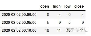 下面是一组5分钟的时间序列,通过ohlc函数获取该时间序列中每组时间的open、high、low和close值