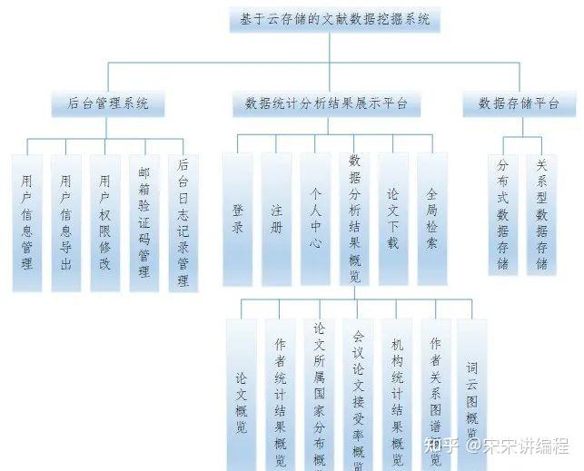 本系统的功能主要分为三个模块,分别是数据统计分析结果展示平台、后台管理系统和数据存储平台,其总体功能架构如图所示。