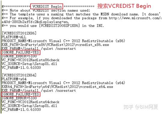 Revit安装包目录下,找到安装包下文件Setup.ini,用记事本打开,然后使用查找功能找到错误的Microsoft Visual C++所在位置,在其后添加语句IGNORE_FAILURE=YES(或者将====== VCREDIST XXXXX ======里面每个VCREDIST20***中全部都添加IGNORE_FAILURE=YES),使Revit安装过程中会忽略错误组件安装错误,保存后再次尝试安装Revit,如下图