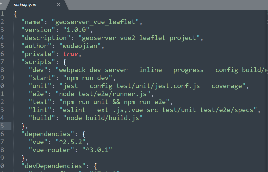 打开geoserver_vue_leaflet\package.json文件,就能看到工程信息和工程依赖等内容,可以看看各依赖的版本号。