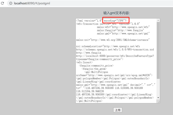 访问:http://localhost:8090/#/postgml,注意gml文本中,encoding要指定为UTF8,与upload方法中指定的content-type编码一致,点击确定,即可将gml上传至geoserver,gml文本可以是增删改查任意内容。
