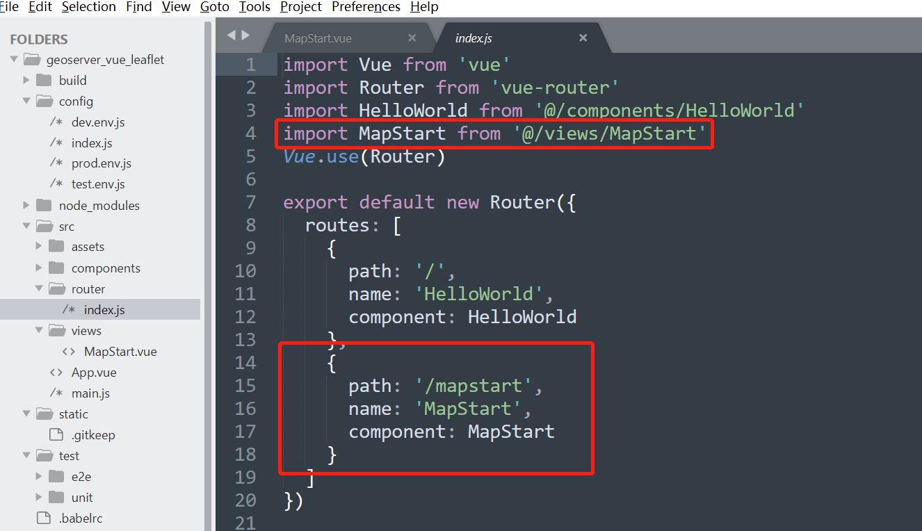在geoserver_vue_leaflet/router/index.js中新建一个路由。