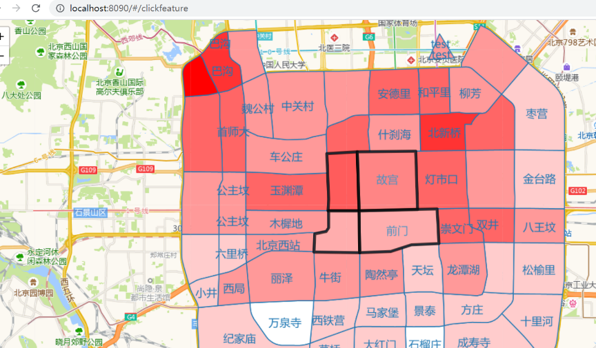访问http://localhost:8090/#/clickfeature,点击地图,效果如下,会渲染黑色边线,白色透明底色的矢量要素: