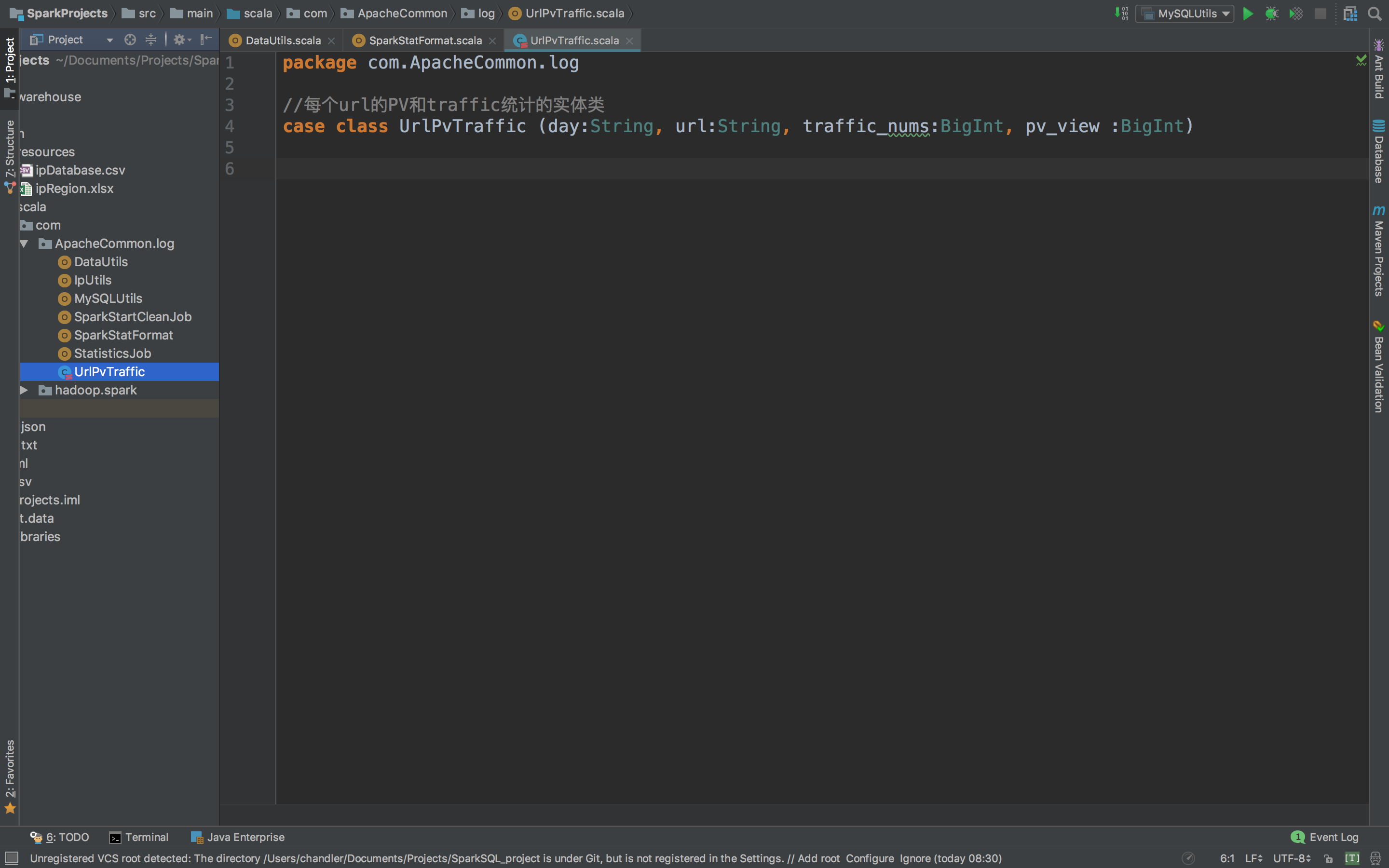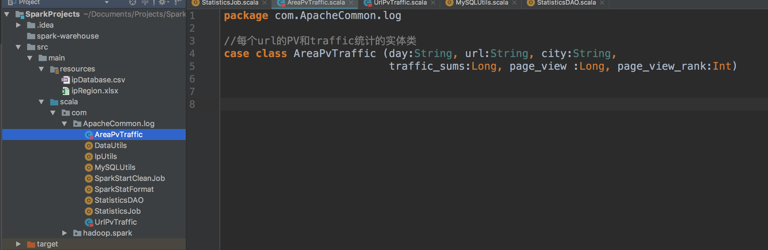 然后在DAO中写插入的代码。下面的def是保存AreaPvTraffic到mysql数据库的代码,上面的是上一个插入代码。