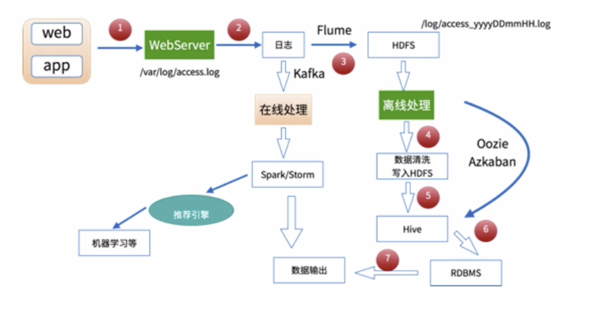 注:用户行为日志:用户每次访问网站时所有的行为数据(访问、浏览、搜索、点击...)、用户行为轨迹、流量日志....