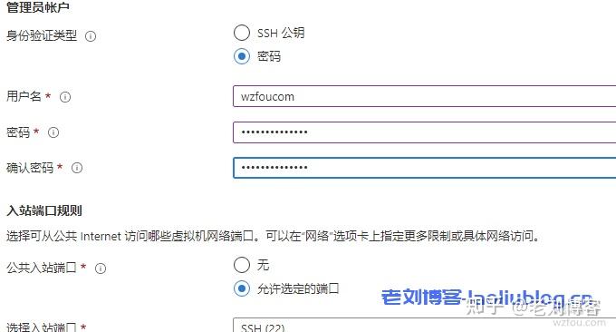 然后就是给你的VPS主机设置一个登录账号和密码了,Azure默认的是没有Root账号的,你需要在创建VPS时先给自己设置一个账号和密码。