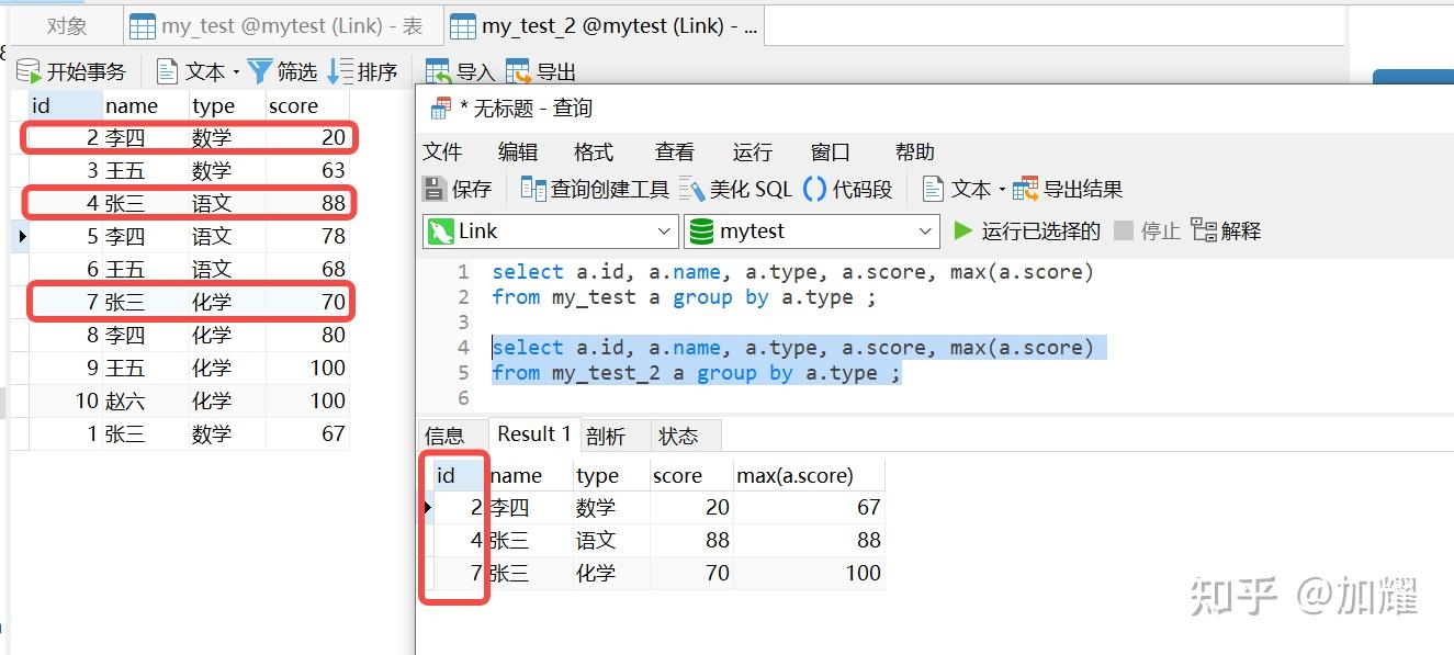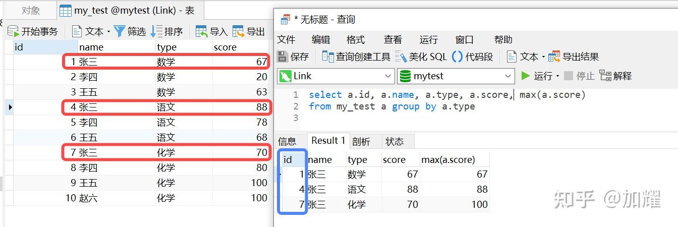 不过对比原数据会发现,在化学这一科目上的学生信息是不对的;化学科目成绩最优的学员应该是 王五和赵六;再回过头来分析一下这个sql会发现, 在mysql中的group by函数,默认分组后取的第一条数据为根据聚簇索引分组得来的第一条记录 ;