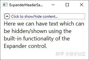 在到目前为止的所有示例中,Expander 控件几乎没有外观,除了用于显示/隐藏内容的按钮 - 它被绘制为内部带有箭头的圆形按钮。不过,您可以使用 Header 属性轻松自定义控件的标题区域。这是我们使用此属性在按钮旁边添加说明文本的示例: