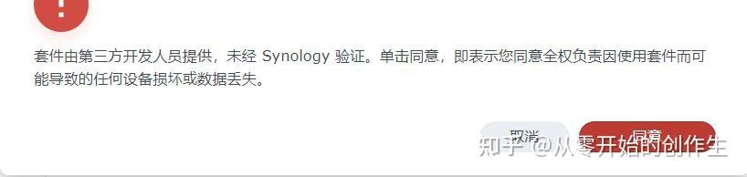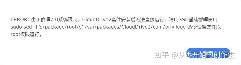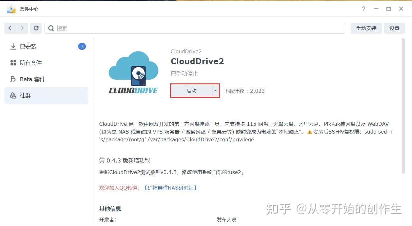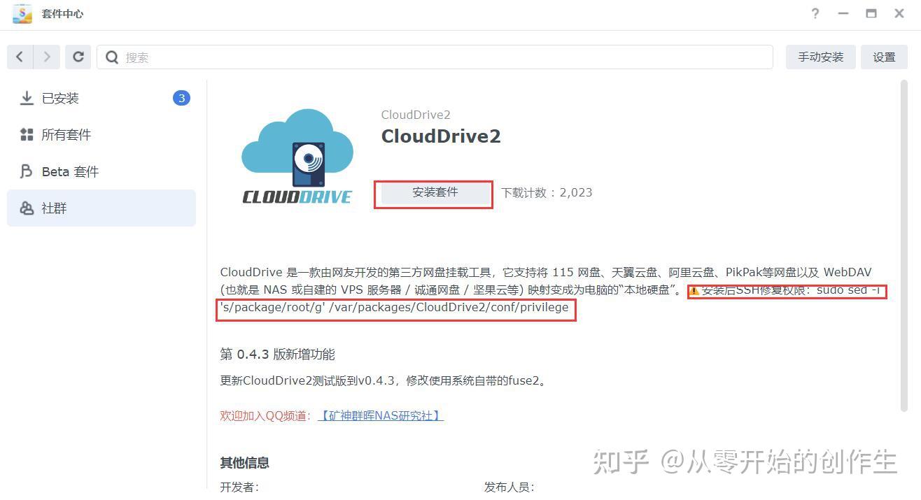 添加好套件源后,在套件中心的“社群”选项卡就会出现很多套件,在里面找到“clouddrive2”套件,点击“安装套件”,安装过程中会弹出警告,点“同意”即可,最后会弹出一个报错,DSM7系统需要输入一串命令才可以使用。