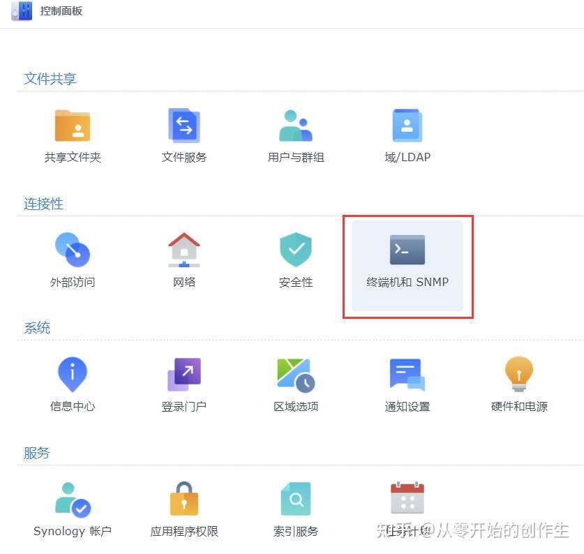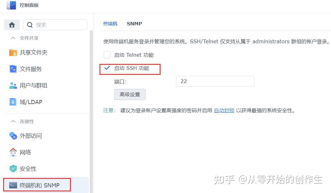 这个操作需要打开群辉的ssh,如图示,具体位置在“控制面板——终端机和SNMP”里面,勾选“启动SSH 功能”就可以了。