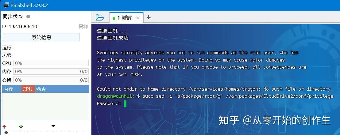 然后打开ssh工具,没有的话网上下载安装一个,输入群辉的ip地址,用户名是群辉用户名,密码是群辉后台的登录密码。登录进去后,在命令行输入 sudo sed -i 's/package/root/g' /var/packages/CloudDrive2/conf/privilege 命令回车,会让你输入密码,输入群辉的登录密码回车就好了。