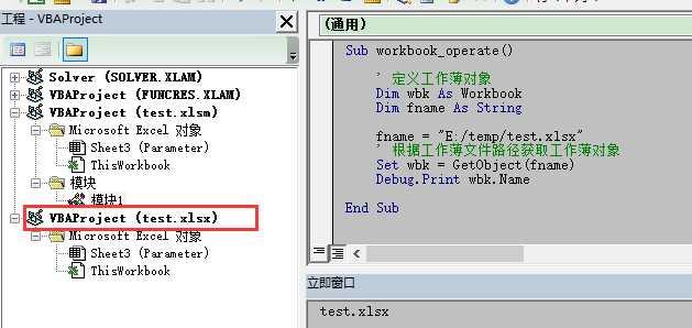 可以在VBE的工程窗口(上图左侧)中看到有一个新的工项目被加载了。但此时是并不能看到有一个Excel文件被打开的,这个已经被VBA隐式打开的文件,只能使用VBA进行操作,在使用上与显式打开后得到的workbook对象没什么区别,如获取其中的工作表对象、获取它的名字、关闭它等,都是一样的。这里就不举例了。
