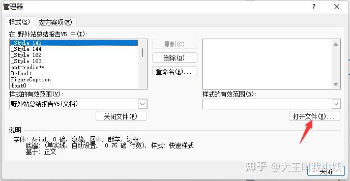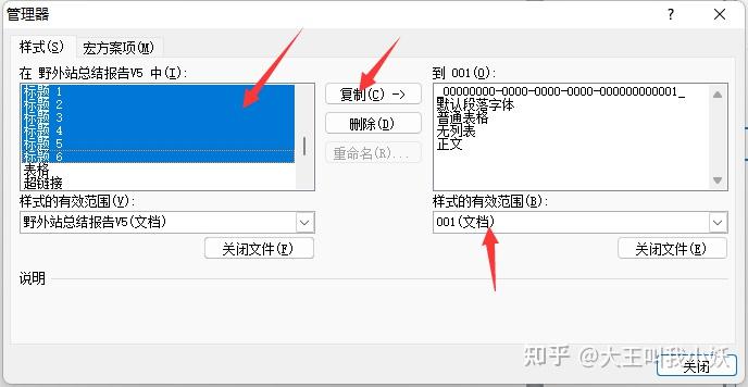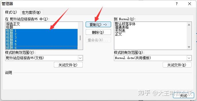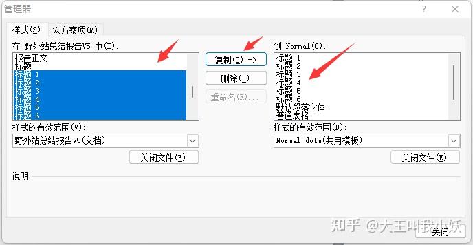 第3步:单击“导入导出”按钮后,会出现“管理器”对话框,这一步很关键就是要把带有要复制的样式“标题1-6”复制到“Normal.dotm”,Normal就是WORD文档的模板,WORD在创建文档都是基于这个模板。把样式复制到模板就是为了以后所以创建的文档都可以使用。以下为复制步骤和复制后效果。