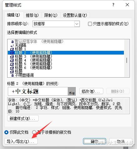第2步:在打开的样式框,下方单击“管理样式”按钮,弹出“管理样式”对话框后,再单击“导入/导出”按钮。